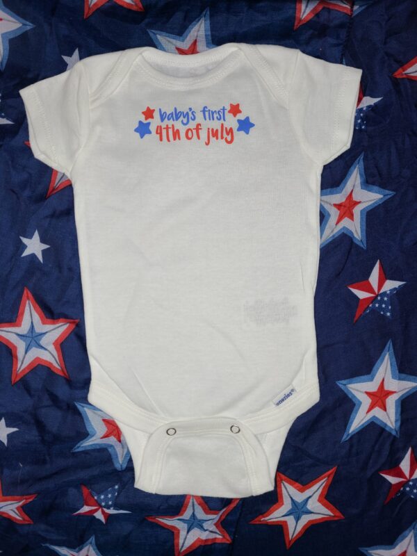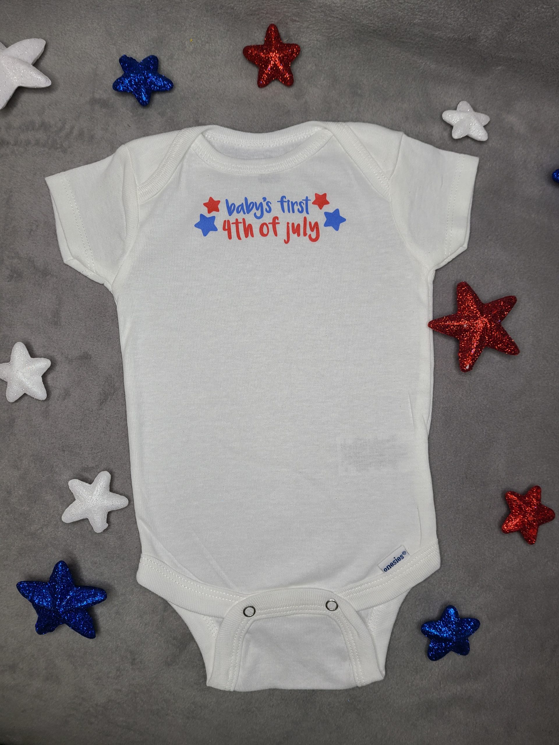 Help the little bundle of joy celebrate our nation’s independence with their Baby’s First 4th of July bodysuit. Perfect Baby Shower Gift for the parents-to-be (or to buy for your own precious one). All bodysuits are made from high quality Onesies® brand (by Gerber®) bodysuits.