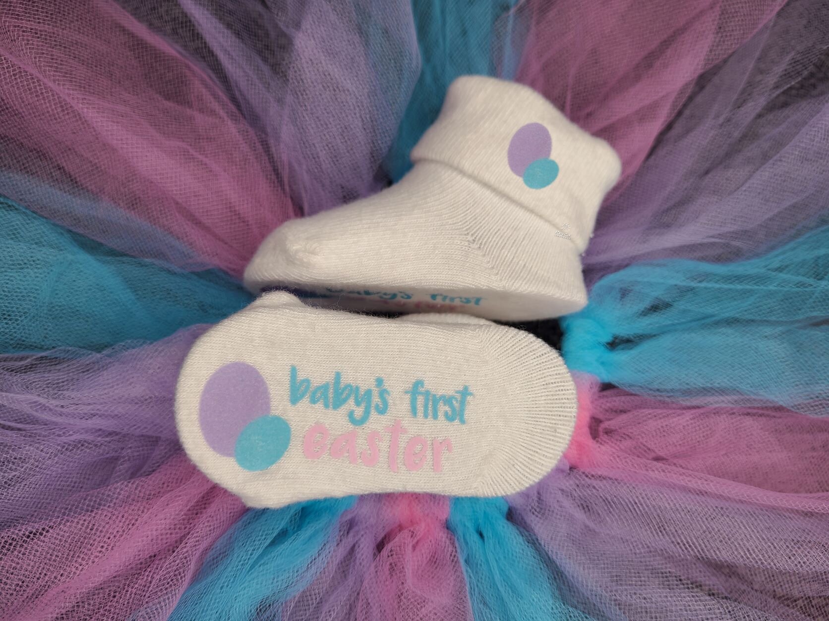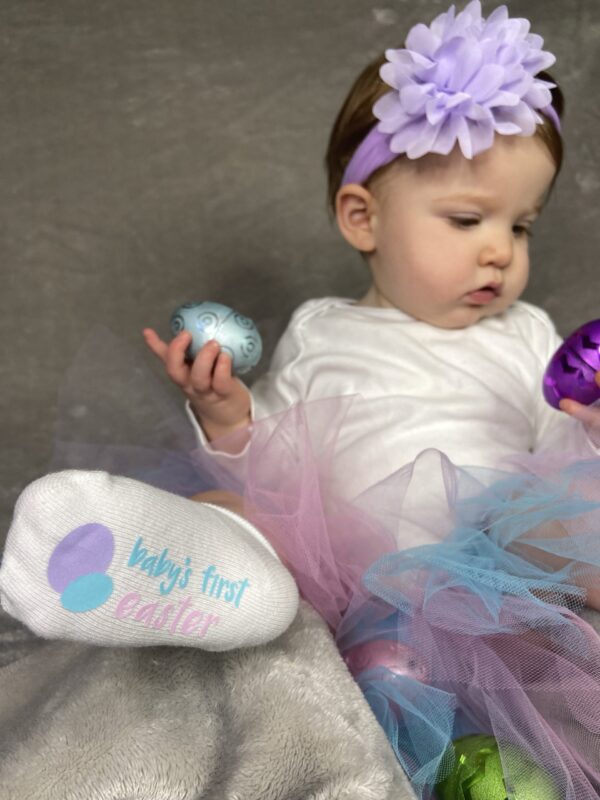 6-12month cuffed baby socks- each sock is roughly 6″ toe to cuff (unfolded) and 2.125″ wide.