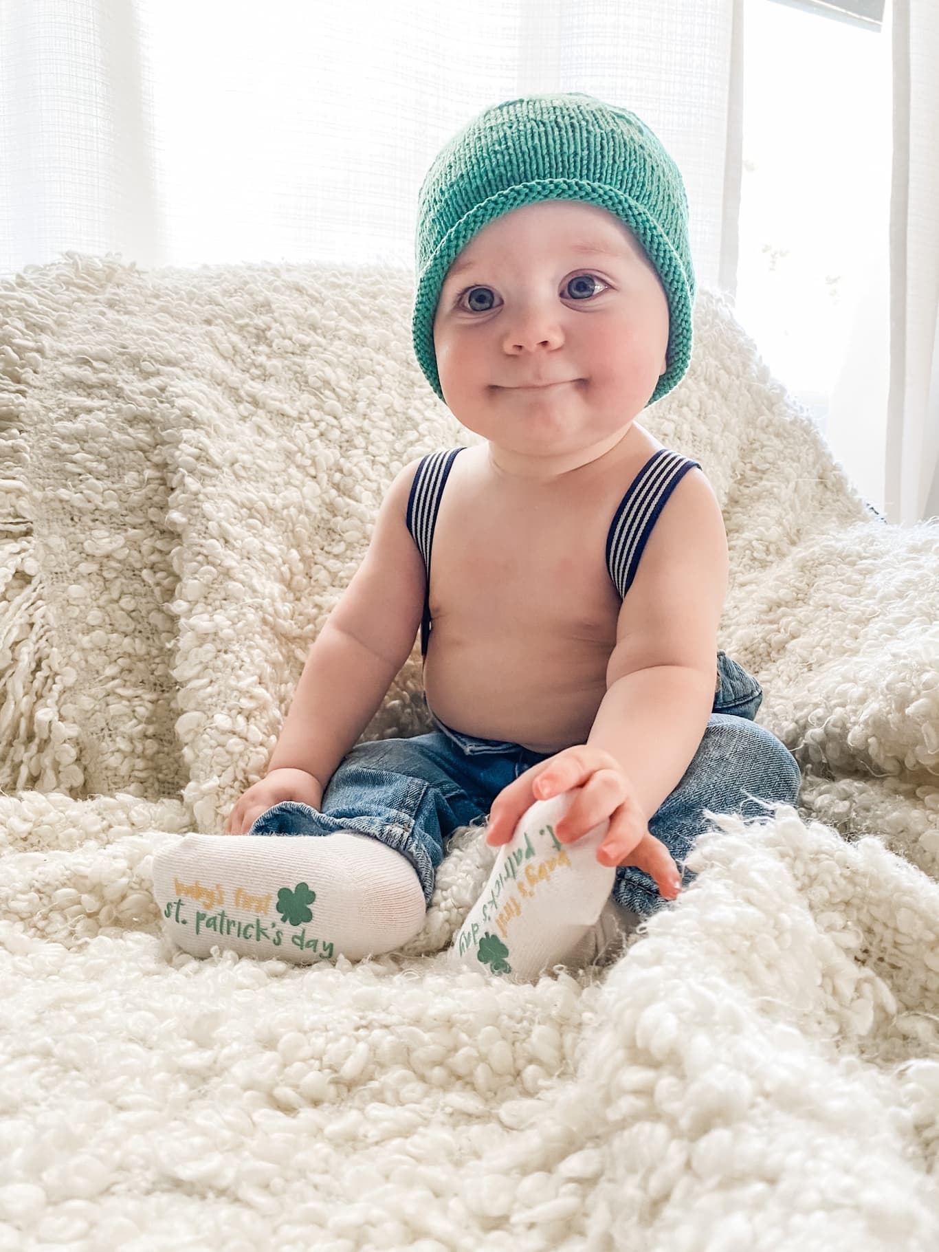 6-12month cuffed baby socks- each sock is roughly 6″ toe to cuff (unfolded) and 2.125″ wide.