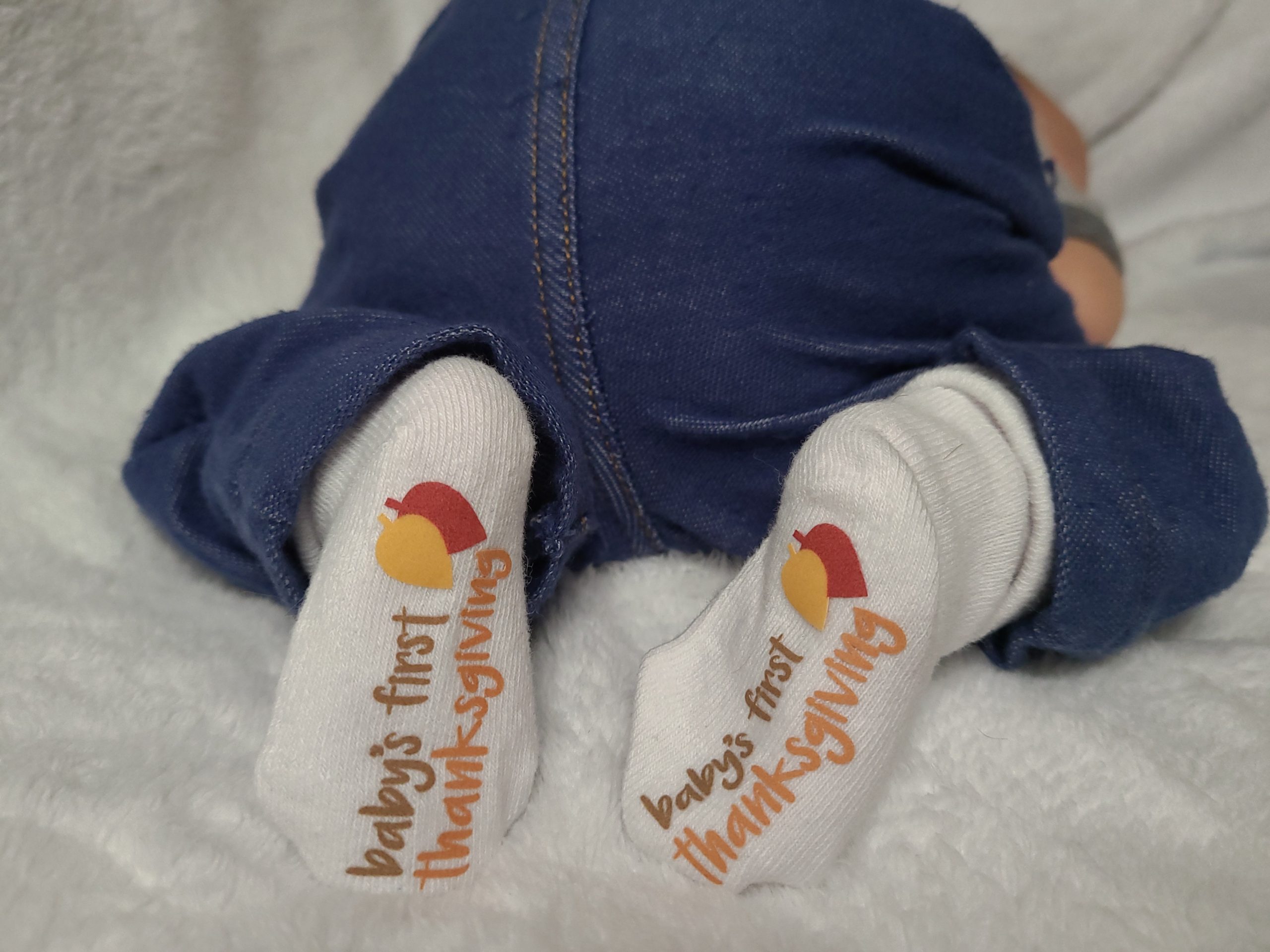 0-6month cuffed baby socks- each sock is roughly 4.75″ toe to cuff (unfolded) and 1.875″ wide.